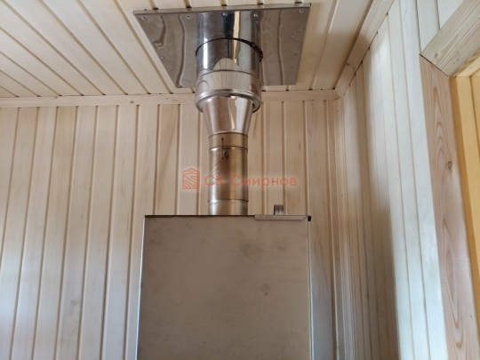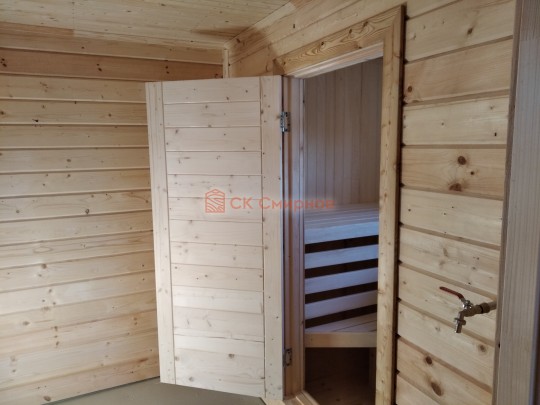 Внутри планировка вполне простая: есть прихожая, большая комната для отдыха, помывочное помещение с выведенным краном и парная. Установлена отличная печь Теплодар с панорамной дверцей. Топка вынесена в комнату и обложена кирпичом: безопасно, красиво, аккуратно.