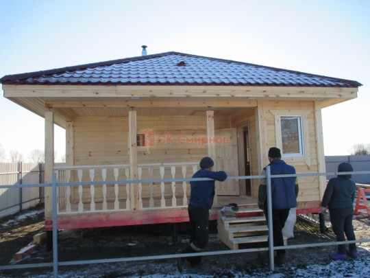 В ноябре 2020 мы завершили строительство первой одноэтажной бани с террасой 6 на 6 метров по проекту №306. Снаружи баня довольно простая: квадратный сруб, шатровая крыша, довольно просторная терраса. Таких бань по русским деревням и посёлкам найдётся немало. Нашу баньку отличает, прежде всего, качество исполнения.