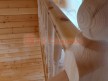 На террасе при условии что она есть делаем перила из строганной доски со всех сторон, столбы террасные также строганные, а не обрезки профилированного бруса с шипом и пазом. Домкратики на столбах для дальнейшей регулировки. Балясины будут сделаны аккуратно. Обратите внимание что в дешёвых случаях это может быть и будет просто вагонка прибирая к неотесанной доске снаружи и столбы будут не квадратные а просто профилированный брус как на видео.