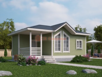 На фото представлен проект дачного дома №279 габаритами 6х8.5 метров и отличной планировкой общей площадью 51 квадратных метров. Можно выделить несколько особенностей проекта: 2 спальни, кухня-гостиная, терраса, санузел. Дом можно построить по каркасной и каркасно-щитовой технологиям. Выбор материалов для наружной отделки обсуждается с каждым заказчиком в индивидуальном порядке.